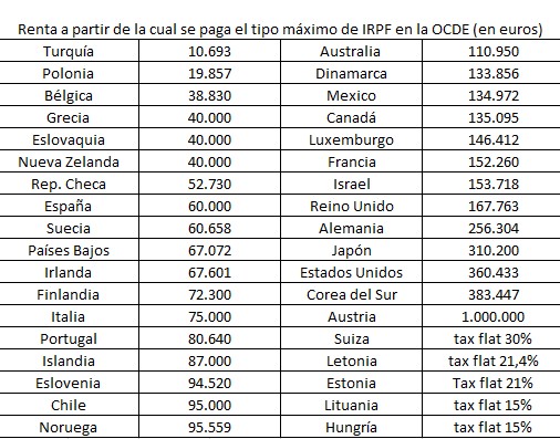 De toda la OCDE -que agrupa a las economías más ricas-, España es el octavo país que más bajo pone el listón de la riqueza en términos absolutos. Así, para pagar el máximo de IRPF es necesario cobrar anualmente más de 60.000 euros. El que encabeza la lista es Turquía, donde se aplica el máximo al superar los 10.693 euros. Pese a ello, un turco necesita ganar 3,2 veces el salario medio del país para pagar el máximo.