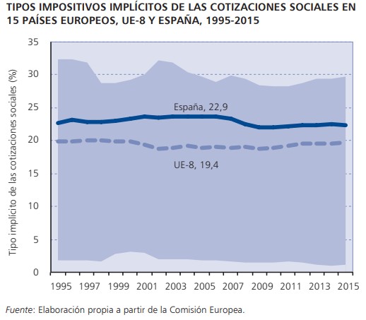 La fiscalidad sobre el trabajo en España alcanza un promedio del 31% entre 1995 y 2015 frente al 37,7% de la UE-8, pero esta menor imposición es el resultado de un menor tipo implícito del IRPF (8,1%) que se compensa con una mayor carga en cotizaciones sociales (22,9%), superior a la media europea.