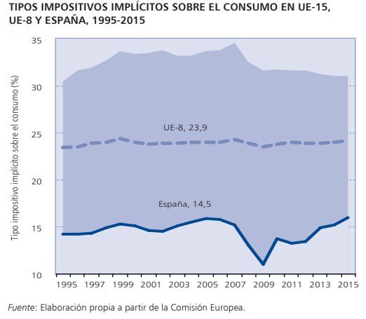 Mientras que España se sitúa a la cola de Europa en imposición indirecta (14,5%), 9,4 puntos menos que el promedio de la UE-8 (23,9%).