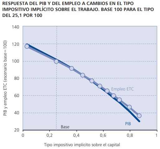 Si los impuestos al trabajo, especialmente las cotizaciones, casi se duplicaran hasta el 57,5% para alcanzar su máximo potencial recaudatorio, los ingresos públicos podrían crecer un 29%, pero a costa de hundir el PIB más de un 31%, destruir el 29% del empleo y recortar los sueldos reales un 20% en un plazo de dos años.