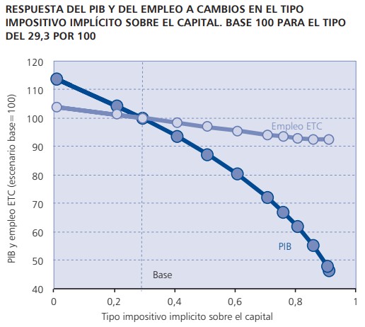 En este sentido, el citado informe recoge los posibles efectos que tendrían diferentes subidas sobre la actividad económica, y el resultado es claro. Si se elevara la tributación sobre el capital del 29,3% actual al 61% para recaudar lo máximo posible (+6%), el PIB se desplomaría un 19,8%, el empleo equivalente a tiempo completo retrocedería un 4,5% y los salarios reales (descontando la inflación) bajarían un 12%, dado que esta estrategia fiscal afectaría muy negativamente a la inversión.