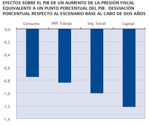 La tributación indirecta, por el contrario, es la menos dañina, puesto que destruiría mucho menos PIB y empleo que los impuestos sobre el trabajo y el capital para conseguir el mismo aumento recaudatorio, sin afectar, además, al salario real de los trabajadores.