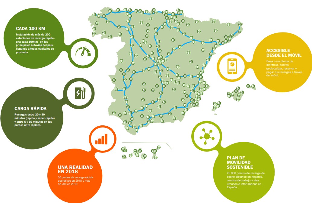 Iberdrola ha iniciado el despliegue de "la mayor red de estaciones de recarga rápida para vehículos eléctricos en las principales autovías y corredores de España", ha asegurado la compañía. Con una inversión superior a 10 millones de euros, permitirá recorrer España de punta a punta con un vehículo eléctrico.