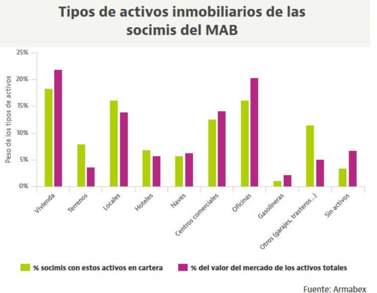 Por su parte, las Sociedades Cotizadas de Inversión en el Mercado Inmobiliario (socimi) son compañías orientadas al mercado del alquiler de vivienda, una inmobiliaria destinada principalmente al alquiler. Por ley, como mínimo el 80% de su activo tiene que estar depositado en inmuebles con esta finalidad. Otro rasgo fundamental de estos productos es su elevada transparencia.Tienen que estar cotizando en mercados regulados. Actualmente, hay 59 socimis cotizando en el MAB -Mercado Alternativo Bursátil- y 4 cotizando en el mercado continuo.