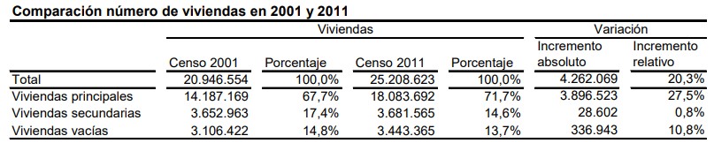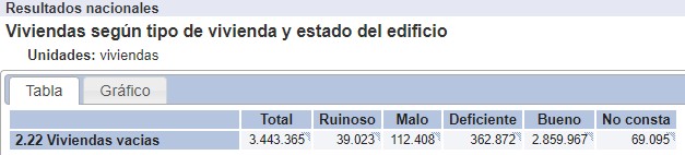 El Instituto Nacional de Estadística (INE) define como "vivienda vacía" las que, sin ser vivienda principal (residencia habitual) ni secundaria (uso ocasional), están abandonadas o desocupadas de forma permanente, pero también las que están disponibles para venta o alquiler. Así pues, aquí ya se incluyen los inmuebles que están en el mercado, de modo que no se puede hablar, en ningún caso, de 3,4 millones de pisos "vacíos" sin más. Es decir, el concepto "vivienda vacía" engloba pisos que están a la venta y en alquiler. Aunque el INE no concreta su número, basta recordar que alguno de los principales portales inmobiliarios del país anuncia más de 1,5 millones de inmuebles en venta o alquiler –no todos están vacíos, pero sirve como referencia–.