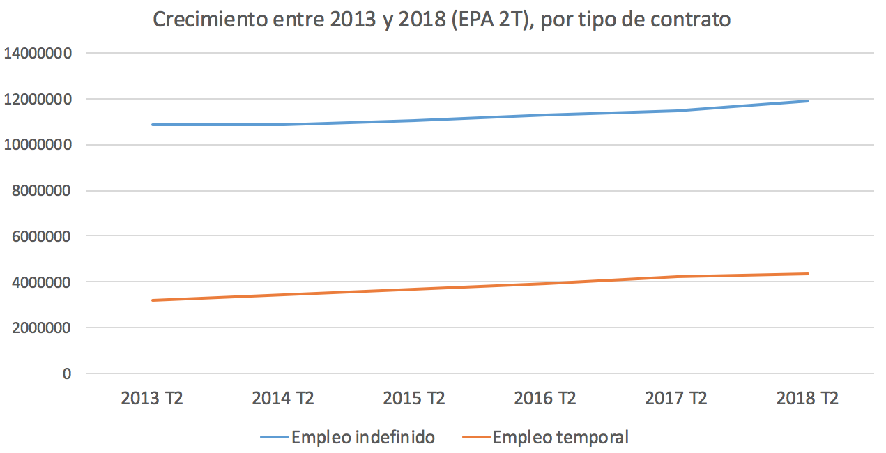 Como podemos ver en el siguiente gráfico, la creación de empleo entre 2013 y 2018 ha sido muy equilibrada en lo tocante al tipo de contrato firmado. La ocupación de los indefinidos ha crecido en 1.049.100 personas, pasando de 10.851.200 a 11.900.300 asalariados durante el período estudiado. En paralelo, los temporales se han movido en niveles de aumento muy parecidos. Si en 2013 había 3.221.000 ocupados en esta situación, en 2018 vemos que esta cifra había crecido hasta las 4.357.000 personas, lo que supone un repunte de 1.136.000 trabajadores.