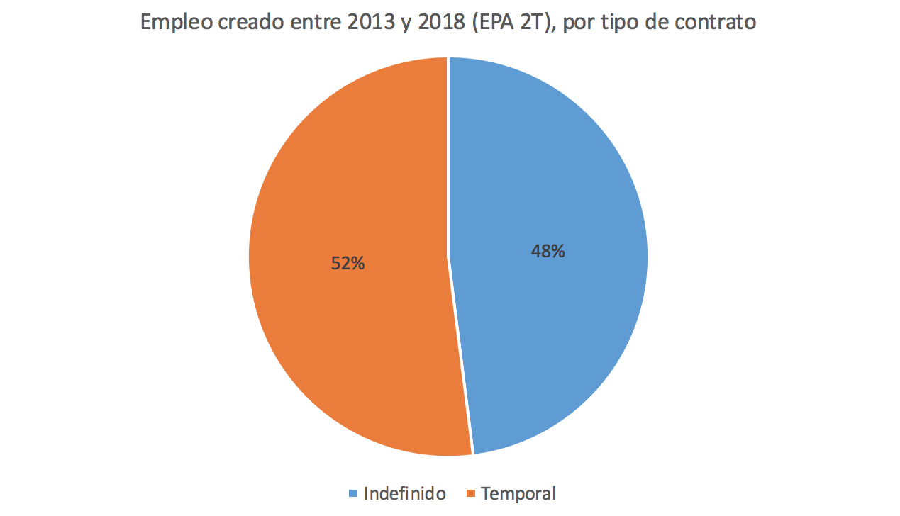 ¿Qué supone esto? En total, una y otra fórmula de contratación han avalado la creación de 2.185.100 puestos de trabajo. De esta cifra, cerca de la mitad son indefinidos (48%), mientras que la otra parte son temporales (52%). No hay, pues, un "giro" a la "precariedad" en el empleo, ni mucho menos.
