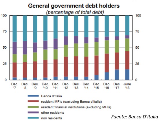 La pérdida de confianza en la economía italiana se hace patente en la participación decreciente de los inversores extranjeros en los títulos de deuda transalpinos. Frente a casi un 40% del total en el año 2008, a menos de un 30% a junio de 2018, mostrándose un descenso acelerado en la presencia en el país durante los últimos dos años y medio.