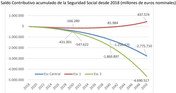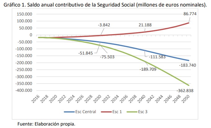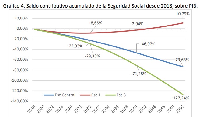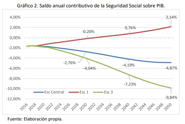 - Escenario 1: con una revalorización del 0,25%, habría que esperar hasta 2032 para que el sistema alcanzara por primera vez un saldo positivo (ingresos superiores a gastos).