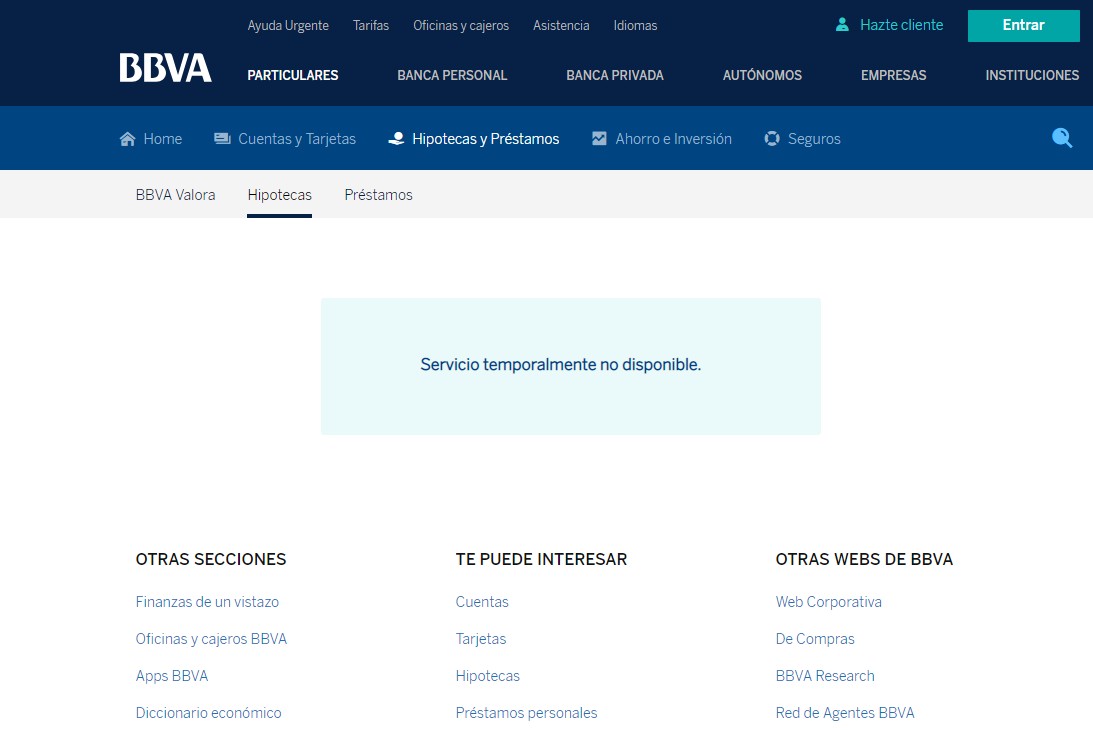Como resultado, la web de hipotecas de BBVA lleva caída durante todo el día de hoy. Un caso similar es el de Banco Santander, que no deja acceder a su simulador de hipotecas. Al pinchar en esta pestaña, remite a los clientes directamente a la home en lugar de al apartado donde se calcularían los préstamos. "Nos estamos adaptando a la operativa con estas nuevas condiciones", insisten fuentes del sector.