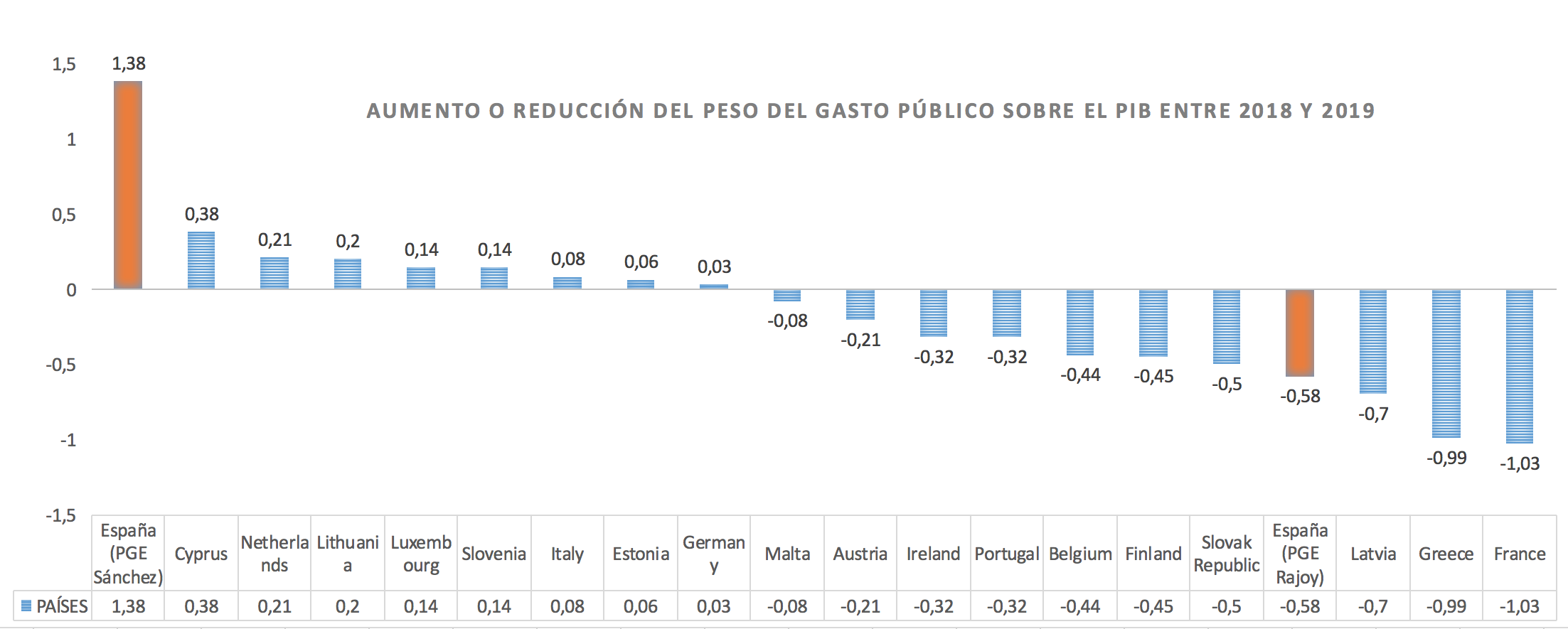 Los socios más austeros serán Eslovaquia, con una caída del gasto equivalente al 0,5% del PIB, Letonia, con un recorte del 0,7%, Grecia, con un tajo del 0,99%, y Francia, con una caída del 1,03%. España habría entrado en este grupo si se hubiese mantenido la senda pactada por Rajoy con Bruselas, puesto que el objetivo para 2019 partía de un recorte del 0,58% del PIB en el tamaño del Estado.