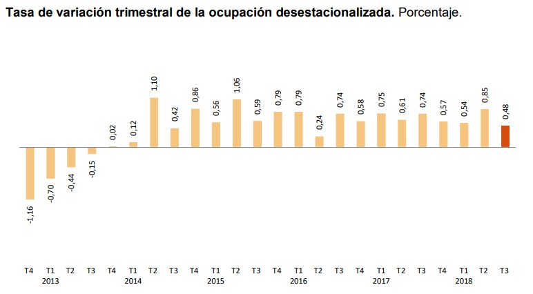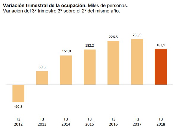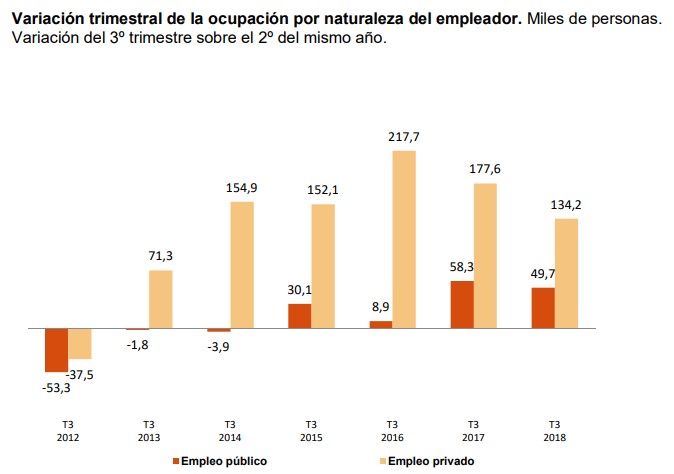 Otro dato relevante a tener en cuenta es que el empleo privado sube en 134.200 personas, el menor aumento en un tercer trimestre desde 2013, hasta situarse en un total 16.360.400, mientras que el empleo público crece en 49.700 personas, hasta 3.167.500. En el último año, el empleo privado creció en 373.300 personas (+2,33%) y el público en 105.500 (+3,44%).