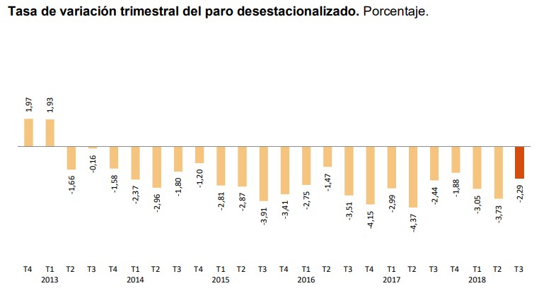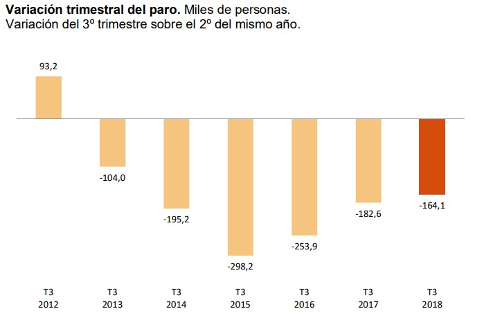 Por otro lado, en cuanto al paro, la EPA arroja un descenso de 164.100 desempleados (-4,7%), hasta un total de 3.326.000, dejando así la tasa de paro en el 14,55%. Se trata de la menor reducción de desempleados en un tercer trimestre desde 2013. El desempleo se reduce este trimestre en los Servicios (58.600 parados menos) y en la Industria (-2.000). En cambio, aumenta en la Construcción en 9.300 y en la Agricultura en 7.800. En el último año, el número de parados ha caído en 405.800 personas (-10,87%).