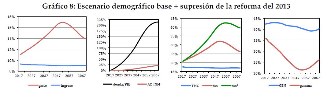 Y si el colapso llegara [en forma de quiebra del Estado español o imposibilidad de acceso a los mercados] y hubiese que ir a un ajuste brusco para adaptarse a los ingresos reales, digamos en 2050, las pensiones tendrían que recortarse de un día para otro en un casi un 50%