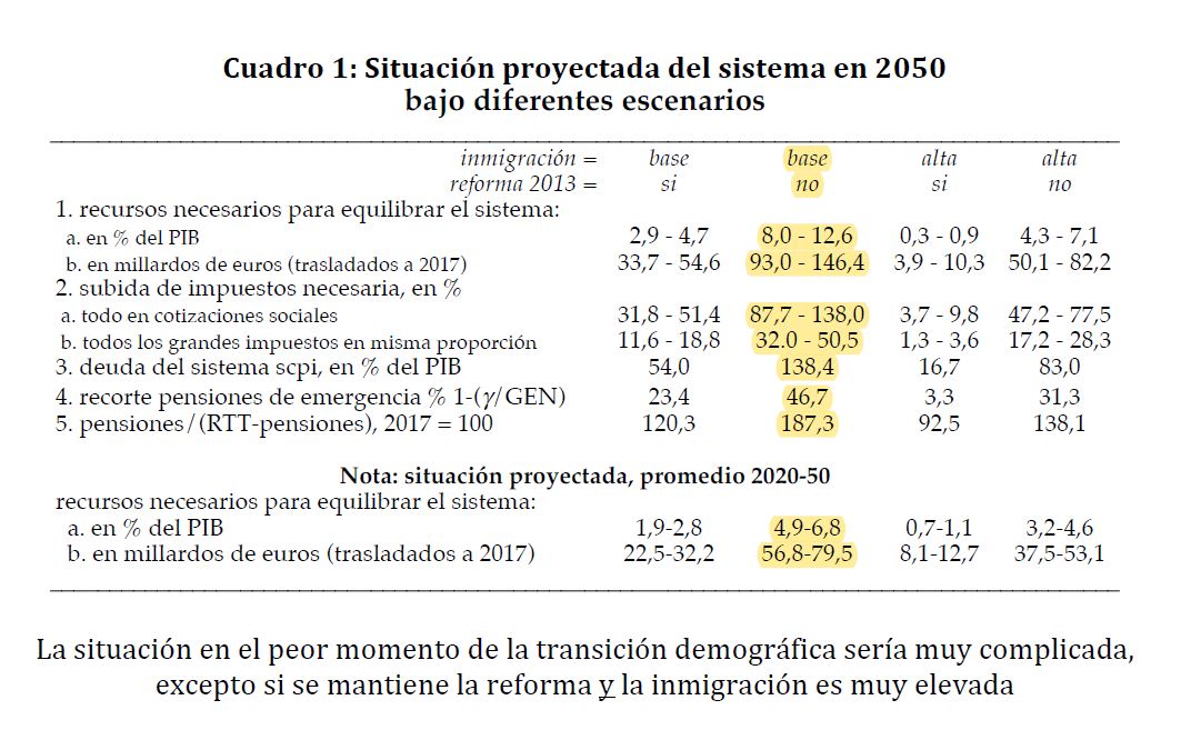 Dependiendo del comportamiento de la inmigración, en el peor momento de la transición demográfica [alrededor de 2050] la financiación de las pensiones llegaría a absorber entre un cuarto y un tercio de las rentas totales del trabajo, incluyendo a los autónomos