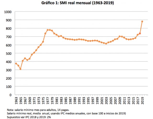 Tras años de subidas modestas y un SMI estabilizado en el entorno de los 650 euros, el anterior Gobierno del PP marcó un punto de inflexión en 2017, con una subida del 8% y otra adicional del 4% en 2018, hasta situar el umbral en los 736 euros actuales. Pero el Plan Presupuestario de 2019 que acaba de remitir Sánchez a Bruselas incluye un aumento histórico del 22,3%, hasta los 900 euros al mes el próximo año. En concreto, tal y como señala Fedea, se trata de la mayor subida desde 1977, alcanzando así un nuevo récord en términos reales (descontando la inflación).