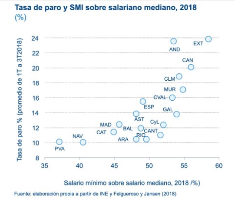 Igualmente, afectaría con más intensidad a las empresas del sector servicios, a las de menor tamaño (pymes), a las no exportadoras y aquellas donde las relaciones laborales no se regulan por convenio colectivo. Y, por último, pero no menos importante, el impacto negativo se concentraría en las regiones más pobres y con tasas de paro más altas, que son aquellas en las que el SMI se aproxima más al salario mediano -divide a los trabajadores en dos partes iguales, los que se sitúan por encima y por debajo-. En este caso, las CCAA más perjudicadas serían Extremadura, Andalucía, Canarias, Castilla-La Mancha y Murcia.