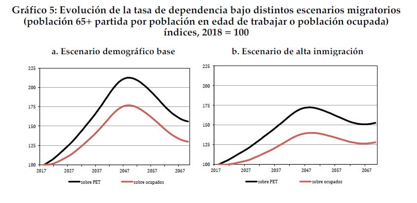 Pues bien, en ninguno de los dos casos, ni siquiera en aquel que plantea una entrada masiva de población en edad de trabajar, se logra contener el incremento de la tasa de dependencia. Y eso suponiendo que sea una inmigración con un nivel de productividad similar al del trabajador medio español, algo que no será sencillo. Pero incluso así, según los cálculos de Fedea, en 2050, el número de mayores de 65 años respecto al de personas en edad de trabajar se situará "entre 0,54 (Alta Inmigración) y 0,68 (escenario base)", lo que supone "un incremento de entre el 73% y el 113%" respecto a los datos actuales.