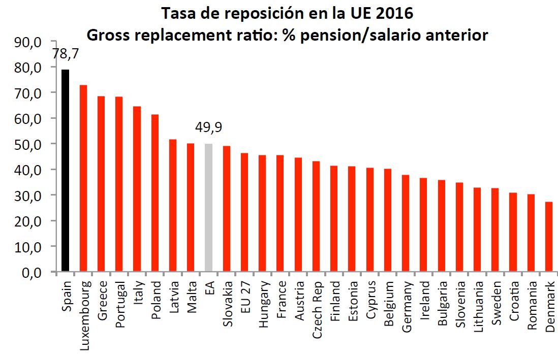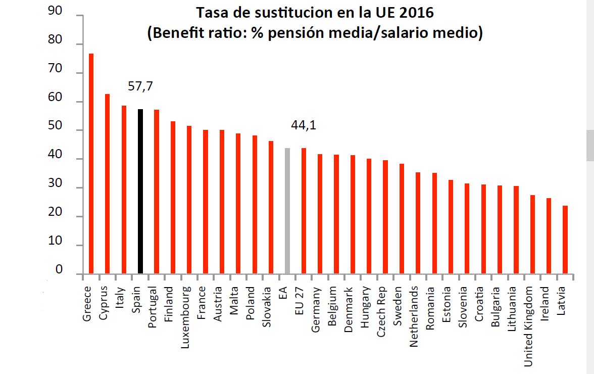 Algo parecido ocurre si miramos a la tasa de sustitución (medida en este caso como relación entre la pensión media y el salario medio). En este caso, España ocupa el cuarto puesto de la UE, con un 57,7%. Y esta cifra es muchísimo más elevada para los nuevos pensionistas que han entrado en los últimos años en el sistema (por ejemplo, el año pasado, Fátima Báñez presumía de que las nuevas altas del régimen general cobraban el equivalente al 93% del salario medio). De nuevo, esta tasa de sustitución es muy superior a la media de la UE (+13,6 puntos), a la de Alemania (+15,7 puntos) o Francia (+7,6 puntos).