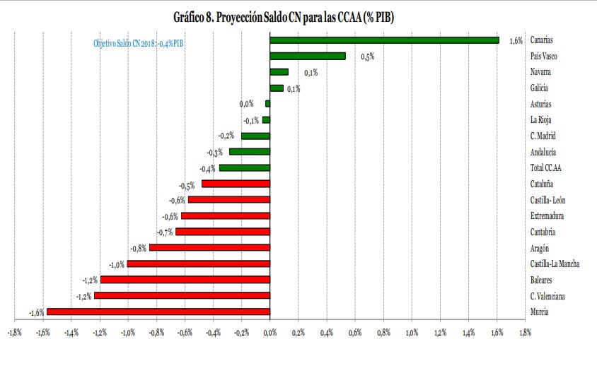 Mientras, las regiones que sí alcanzarán el objetivo de déficit del 0,4% serán Andalucía (-0,3%), Comunidad de Madrid (-0,2%) y La Rioja (-0,1%), que cumplirán el objetivo aunque seguirán presentando déficits; y Asturias (0%), Galicia (+0,1%), Navarra (+0,1%), País Vasco (+0,5%) y Canarias (+1,6%), que cumplirán igualmente el objetivo sobradamente, llegando a registrar superávits. La mayor parte (cerca del 1% del PIB) del notable superávit previsto para Canarias (+1,6%) se debe a que la Ley de PGE de 2017 habilitó a esta región para poder percibir el Fondo de Competitividad.