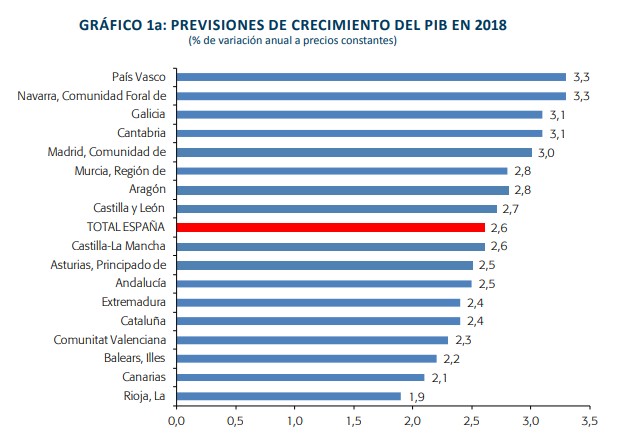 Por otro lado, el menor crecimiento de la economía española no está afectando por igual a todas las comunidades autónomas. Siete acelerarán o mantendrán el ritmo este año respecto a 2017, mientras que las 10 restantes sí sufrirán desaceleración. Las regiones más dinámicas serán, por este orden, País Vasco, Navarra, Galicia, Cantabria y Madrid, que crecerán todavía el 3% o por encima de ese nivel, según las previsiones que Funcas presentó el pasado lunes. Murcia, Aragón y Castilla y León también crecerán por encima de la media nacional (2,6%).