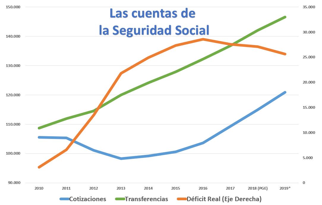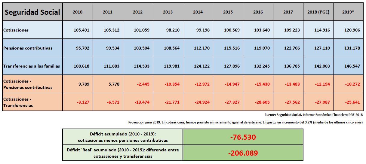 Nota del redactor: en las cuentas de esta década, hemos incluido los años 2018 y 2019. Para estos dos ejercicios, nuestras previsiones son conservadoras (es decir, si acaso, más bien optimistas). Para 2018 hemos dado por buenas las cifras de los PGE. Para 2019, hemos manejado una previsión de ingresos en la que las cotizaciones crecen al 5,1% (igual que lo previsto para este año, a pesar del menor crecimiento económico) y de gastos que crecen al 3,2% (menos que este año; hemos cogido la media de los últimos cinco año