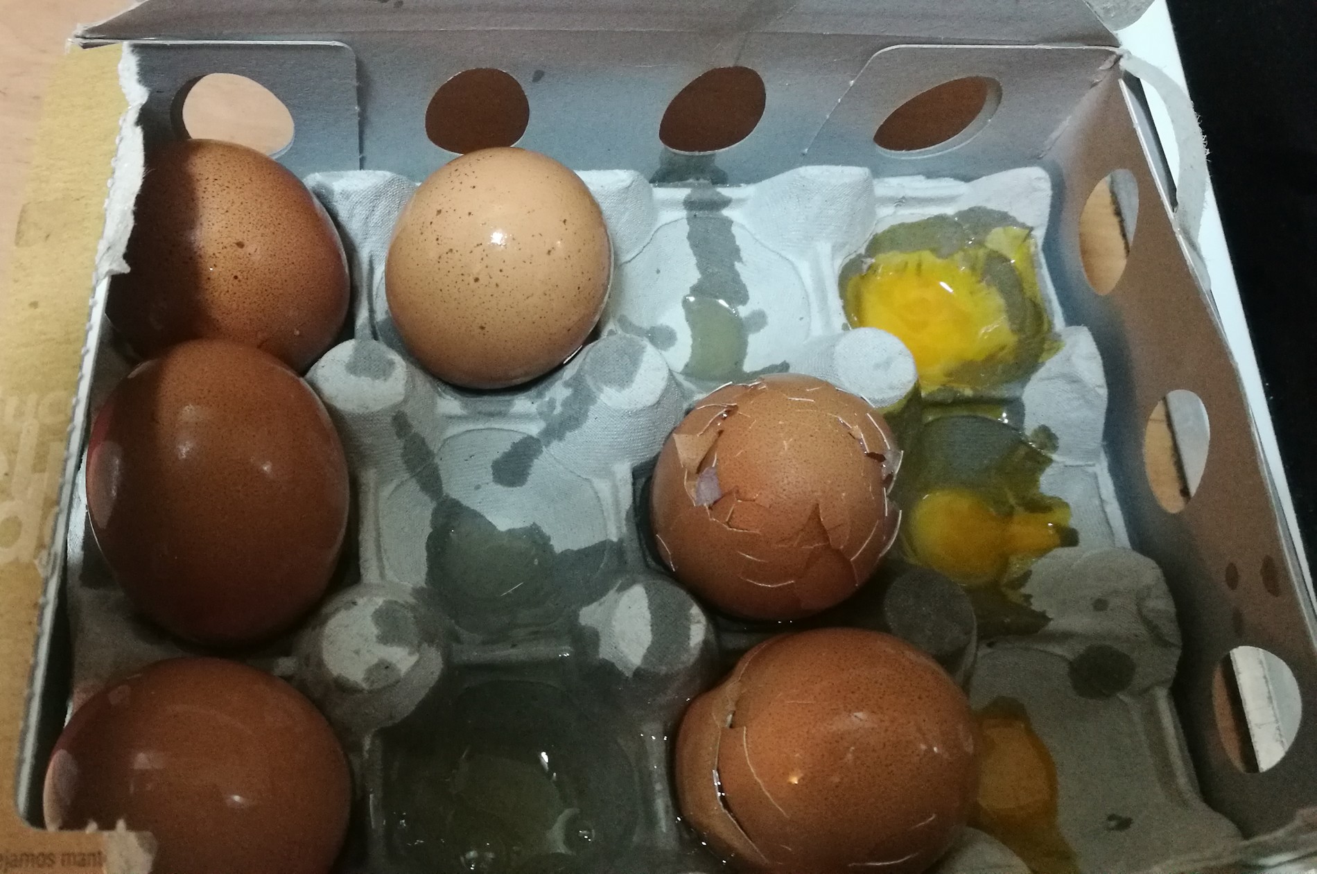 Sigo repasando artículos hasta que llega la hora de abrir la caja de los huevos y ... lo que me temía. Dos cascarones rotos embadurnan a sus compañeros de docena. El trajín del transporte ha asestado un duro golpe a este delicado producto.