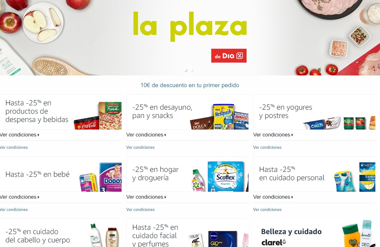 Para empezar, lo primero que hay que hacer es seleccionar La Plaza en el apartado de Comprar por tienda. Una vez dentro, mi primer impulso es echarle un vistazo a las ofertas. La decepción me invade. No encuentro por ningún lado ni esos 2X1, ni esas segundas unidades al 50% que tanto le gustan a DIA y a La Plaza. Algunos productos sí están rebajados, pero van desde unos pocos céntimos al 25%.