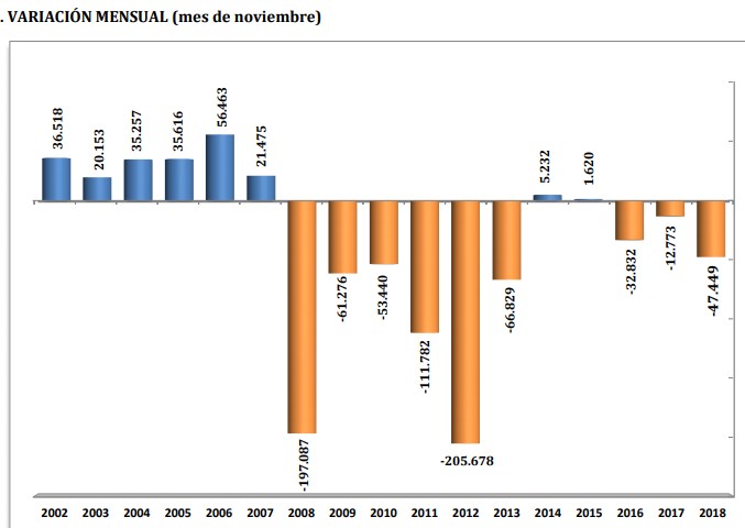 La Seguridad Social perdió una media de 47.449 afiliados (-0,25%) con respecto a octubre, hasta situarse en un total de 18.945.624 ocupados. Se trata del peor dato desde noviembre de 2013, cuando la economía nacional salió de la recesión. En los dos años anteriores, la afiliación también bajó en noviembre, aunque en menor cantidad. Así, en 2016 se redujo en 32.832 personas y en 2017, en 12.773 cotizantes. Por contra, en 2015 y 2014 se registraron aumentos después de un periodo (2008-2013) de fuertes descensos de la ocupación.