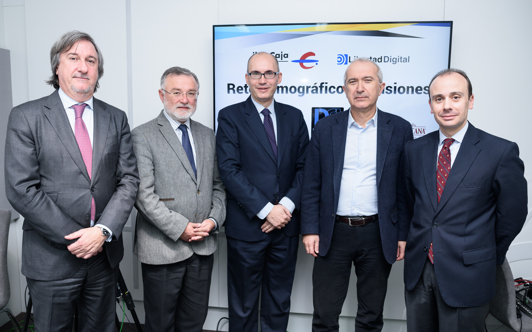 El nuevo debate de Diálogos en Libertad ha corrido a cargo de expertos como José Carlos Vizárraga, director de Ibercaja Pensión; Miguel Ángel García, de Fedea; José María Rotellar y John Müller. En el centro, el moderador del debate, Domingo Soriano
