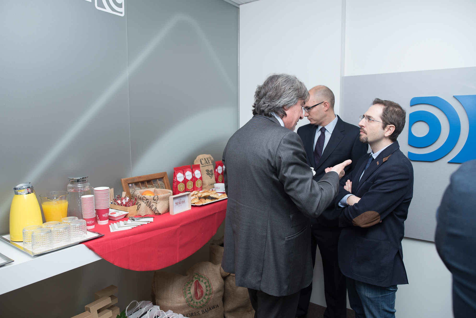 José Carlos Vizárraga, director de Ibercaja Pensión, charla con los redactores de Libertad Digital Domingo Soriano y Manuel Llamas mientras toman un café de Cafés La Mexicana.