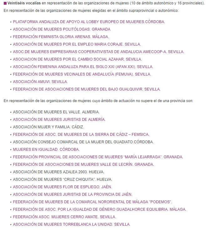 Las políticas de igualdad de la Junta son canalizadas a través del Consejo Andaluz de Participación de las Mujeres, que "vela por el incremento de la participación de las mujeres en los procesos de toma de decisiones, presta asesoramiento a la Administración y promueve la difusión de los valores de la igualdad entre la sociedad andaluza". ¿Y quién compone este particular ente? Altos cargos de la Junta, empezando por la propia presidenta andaluza, y un total de 26"organizaciones de mujeres"seleccionadas. He aquí el listado: