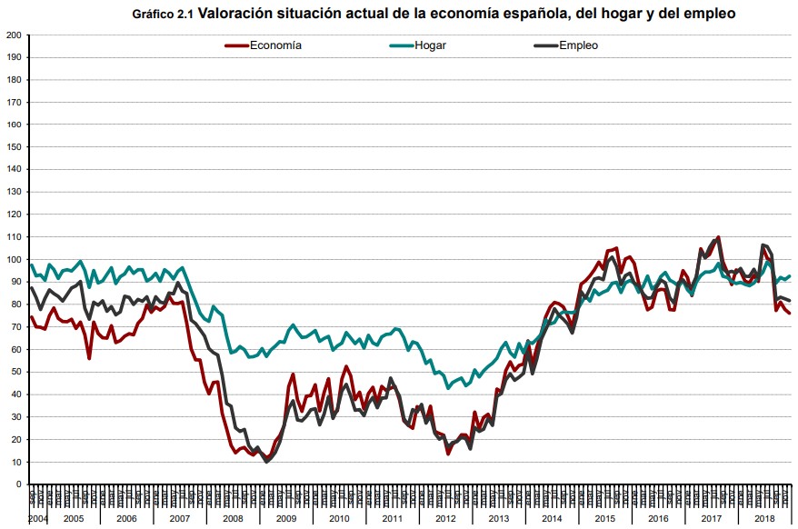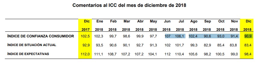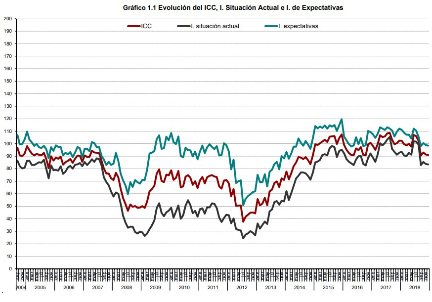 El ICC cerró 2018 en 90,9 puntos, tras bajar 11,6 respecto a 2017, siendo ésta la mayor caída desde 2012, cuando la crisis del euro estaba en su máximo apogeo y España se situaba en el ojo del huracán, según el último dato publicado el pasado jueves por el Centro de Investigaciones Sociológicas (CIS). Se trata, además, de la peor puntuación desde finales de 2016. La valoración de la situación actual se hunde 9,4 puntos, mientras que las expectativas ofrecen un descenso aún mayor, de 13,6.