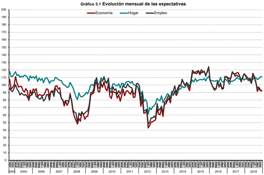 El indicador de situación actual se situó en diciembre en los 83,4 puntos y el de las expectativas cerró en 98,4 puntos, ambos en terreno negativo. Dentro del indicador de situación actual, la valoración de los consumidores sobre la evolución general de la economía es 19,2 puntos inferior a la de un año antes y la del mercado de trabajo ha retrocedido 12,3 puntos respecto a 2017. Por contra, la percepción sobre la situación de los hogares ha mejorado 3,2 puntos en 2018.