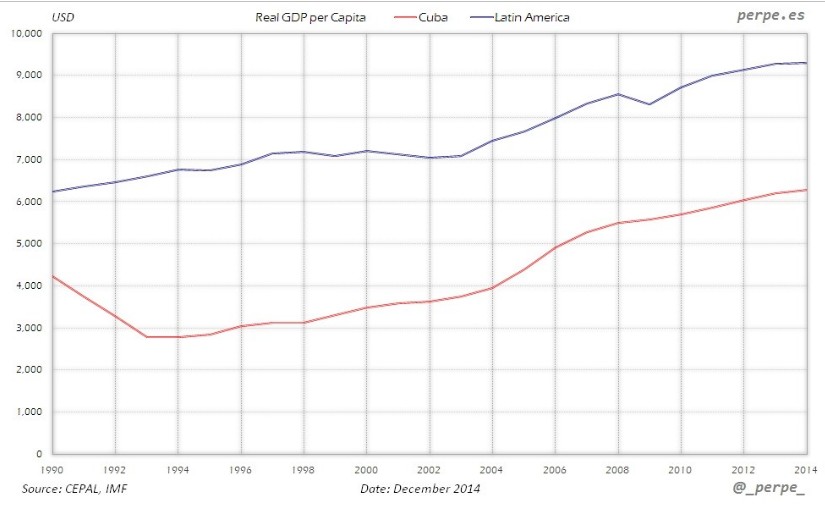 Para empezar, debemos remontarnos a la Cuba anterior a la revolución. Fidel Castro llegó al poder el 1 de Enero de 1959. Antes de la revolución, Cuba era un 80% más rica que los países latinoamericanos y su mortalidad infantil era menos de un tercio que la de los demás países latinoamericanos. El Producto Interior Bruto per cápita de la isla era igual al español, pero, a partir de la revolución, podemos observar cómo el PIB per cápita de España despega de manera meteórica, mientras que el cubano queda casi estancado.
