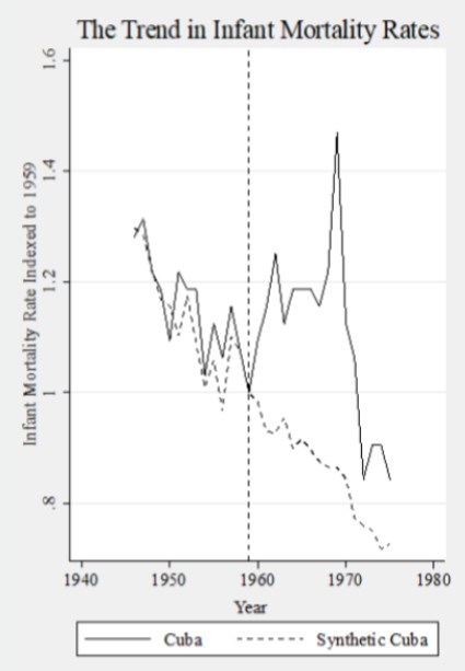Además, otro estudio reciente sobre la mortalidad infantil cubana de Jamie Bologna Pavlik y Vincent Geloso estima que, de no haberse producido la revolución, la tasa de mortalidad infantil habría seguido bajando y habrían muerto 33.000 niños menos. En el siguiente gráfico podemos comprobar la gran diferencia.