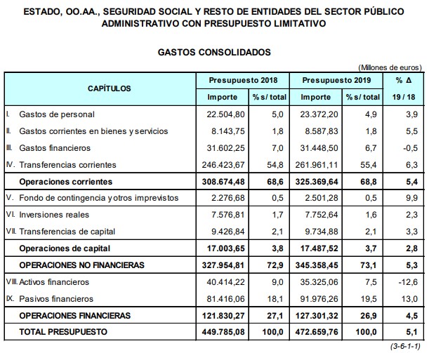 Según el proyecto presentado este lunes en el Congreso, el presupuesto consolidado de gastos ascenderá a un total de 472.660 millones de euros en 2019, lo que supone un incremento del 5,1% respecto a las cuentas de 2018, esto es casi 23.000 millones más que el Presupuesto de 2018. Habría que retroceder al año 2013 para encontrar un aumento superior (+46.000 millones de euros), en base siempre a las previsiones presupuestarias (el gasto realmente ejecutado puede variar).