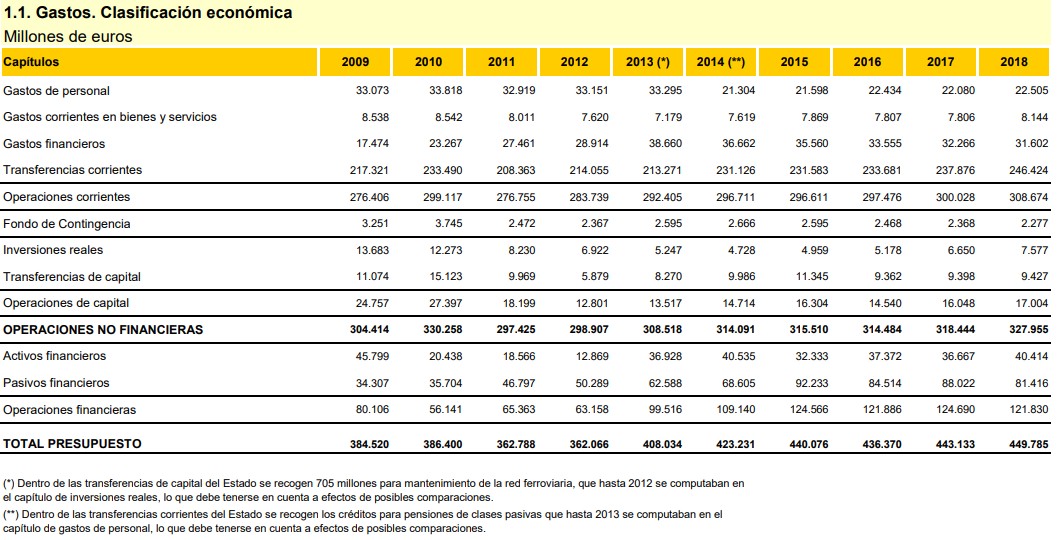 En concreto, el 71,7% de las transferencias se destinan a familias e instituciones sin fines de lucro, siendo su componente más importante las pensiones. Las transferencias a las Administraciones Territoriales representan el 17,1% sobre el total. Por su parte, los gastos de personal ascenderán a 23.372 millones de euros, un 3,9% más que un año antes, y los gastos corrientes de bienes y servicios suman 8.588 millones de euros, un 5,5% más. De su lado, los gastos financieros (intereses de deuda), que sumarán, 31.449 millones de euros, caerán un 0,5% como consecuencia de los menores costes de financiación pública.