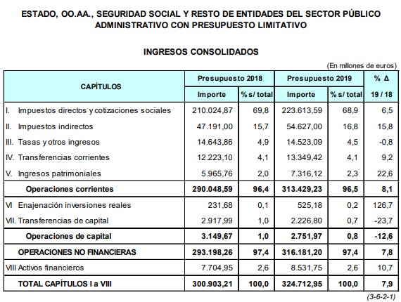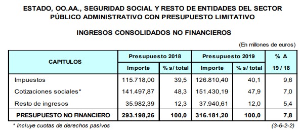 En cuanto a los ingresos, el presupuesto consolidado asciende a 324.713 millones de euros en 2019, lo que representa un incremento del 7,9%, casi 24.000 millones más que los PGE de 2018, mientras que los ingresos no financieros se sitúan en un total de 316.181 millones de euros, con un aumento del 7,8% (+23.000 millones).