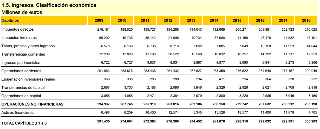 Los recursos más importantes son los impuestos y las cotizaciones sociales, que representan en conjunto el 88% del importe total de ingresos no financieros consolidados. El resto de recursos está compuesto, fundamentalmente, por transferencias, tasas e ingresos patrimoniales.