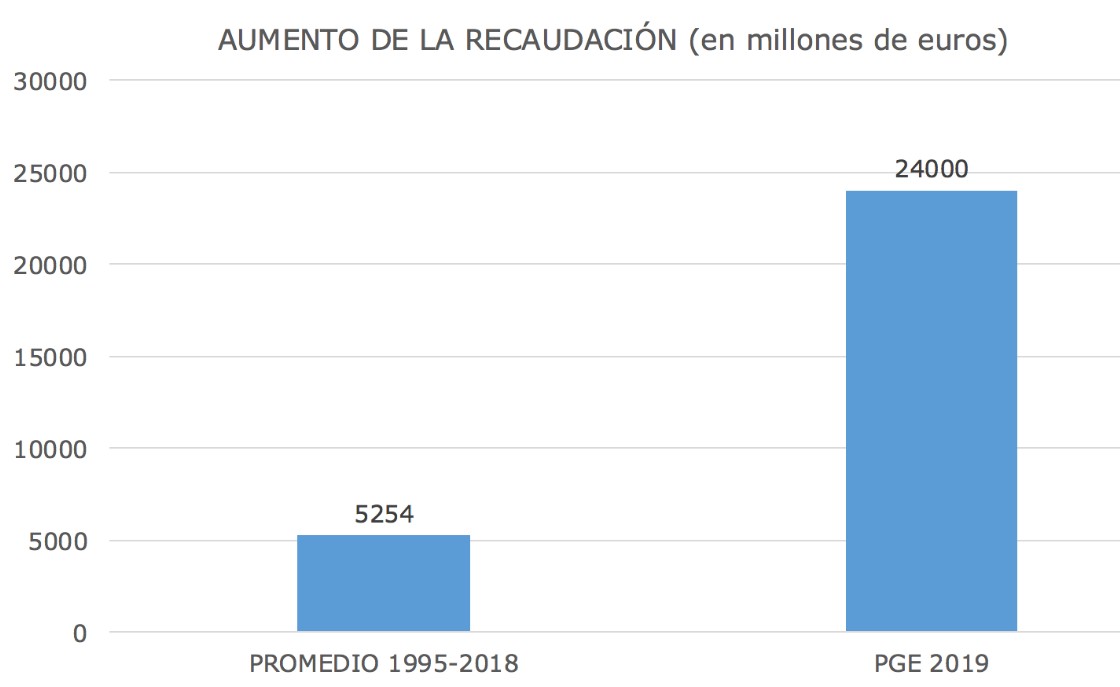 De acuerdo con los datos de Hacienda, el aumento medio de la recaudación tributaria entre los años 1995 y 2018 fue de 5.254 millones de euros. Sin embargo, el Ejecutivo socialista plantea en sus cuentas para el próximo año un aumento casi cinco veces mayor, con un repunte de 24.000 millones en la recaudación proyectada para 2019. Lo vemos en el siguiente gráfico: