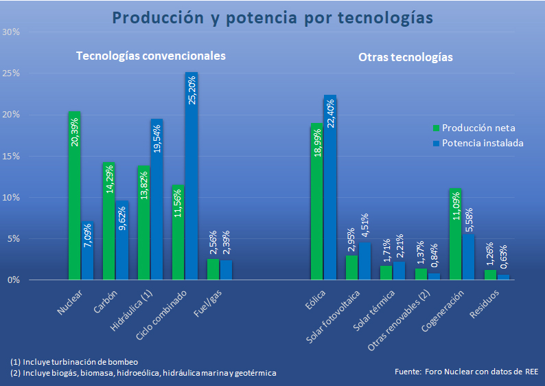 La energía nuclear ha sido nuevamente en 2018 la fuente de generación eléctrica que mayor contribución ha realizado al sistema eléctrico español. Con tan solo el 7,09% del total de la potencia instalada, los siete reactores nucleares españoles han producido el 20,39% del total de la energía eléctrica. Es decir, más de una quinta parte de la electricidad consumida en España, constituyendo una base "firme y predecible" para la garantía del abastecimiento de electricidad, según ha detallado el presidente de Foro Nuclear, Ignacio Araluce, durante un almuerzo informativo celebrado el pasado jueves.