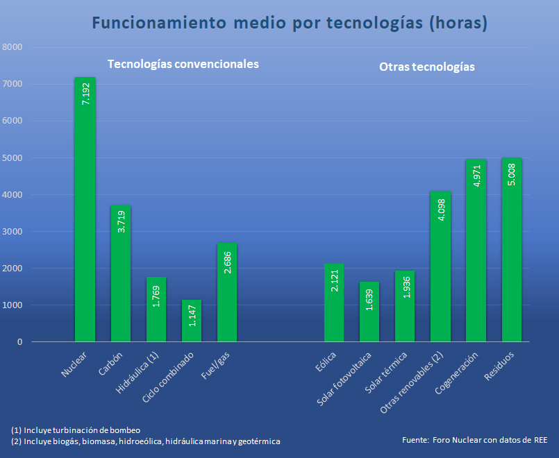 Según datos de Red Eléctrica, las centrales nucleares han sido, una vez más, la fuente que más horas ha operado en 2018: 7.192 horas de las 8.760 que tiene el año, frente a las 1.800-2.000 horas de funcionamiento anual medio de las renovables. Esto representa, de media, el 82,1% del total de las horas del año, un porcentaje muy por encima de otras tecnologías, lo cual, en palabras Araluce, "refleja la disponibilidad, la fiabilidad y la estabilidad del parque nuclear, que funciona con altísima regularidad, posibilitando así una adecuada gestión y la garantía del funcionamiento del sistema eléctrico".