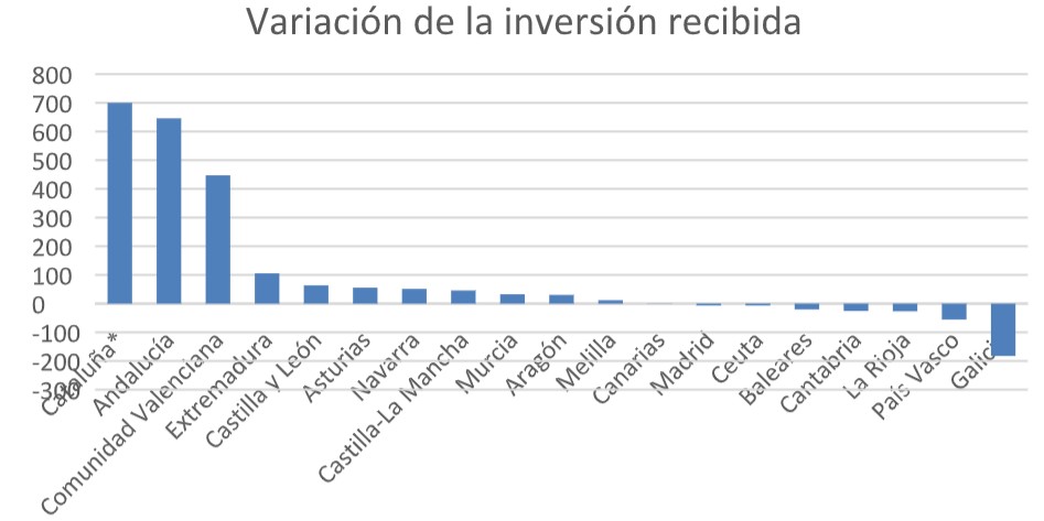 Y en términos de inversiones por habitante, más de lo mismo. De igual modo, Cataluña es una de las que más recibe por habitante, un 48,9% más, mientras que Madrid pierde un 1,6% y se queda por debajo de la media (que crece un 17,7%), lo que confirma el reparto electoral que hace el Gobierno al estilo de Zapatero. Entonces, llegó a disminuir la inversión en Madrid mientras subía la del resto, hasta un 44% la de Cataluña. Camino de eso volvemos a ir.