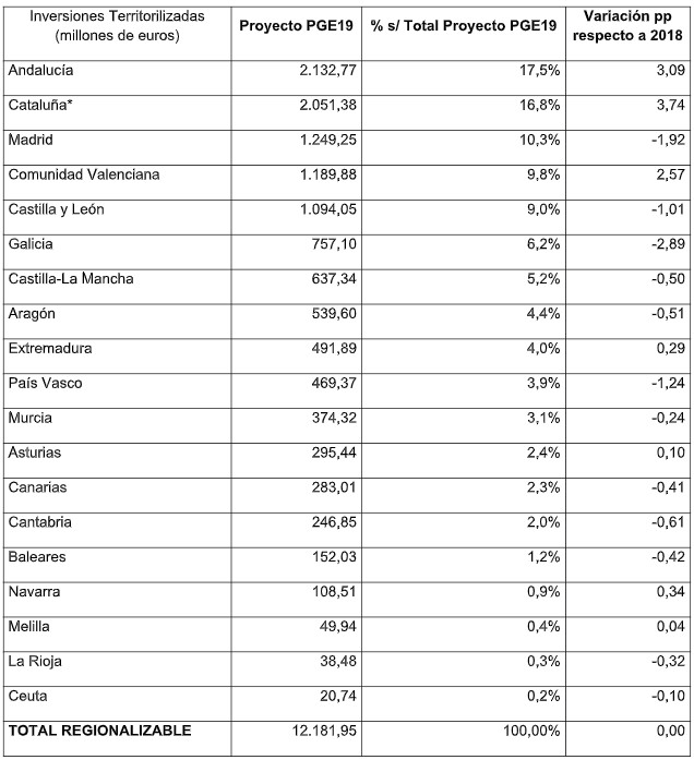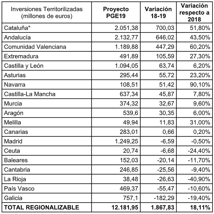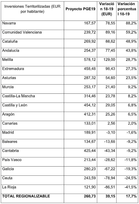 Y también paga favores, como el aumento del 90% de la inversión en Navarra, así como el precio de los independentistas al apoyo de la moción de censura y a mantener a Sánchez en La Moncloa: en Cataluña, la inversión la incrementa un 52%, con 700 millones más que en 2018. Adicionalmente, también le concede 200 millones más accediendo a las exigencias independentistas equiparando la inversión de la administración central en Cataluña con el peso del PIB de Cataluña en el conjunto nacional. El precio de la estancia en La Moncloa se pone negro sobre blanco, y veremos si no hay peores contrapartidas fuera del ámbito presupuestario.