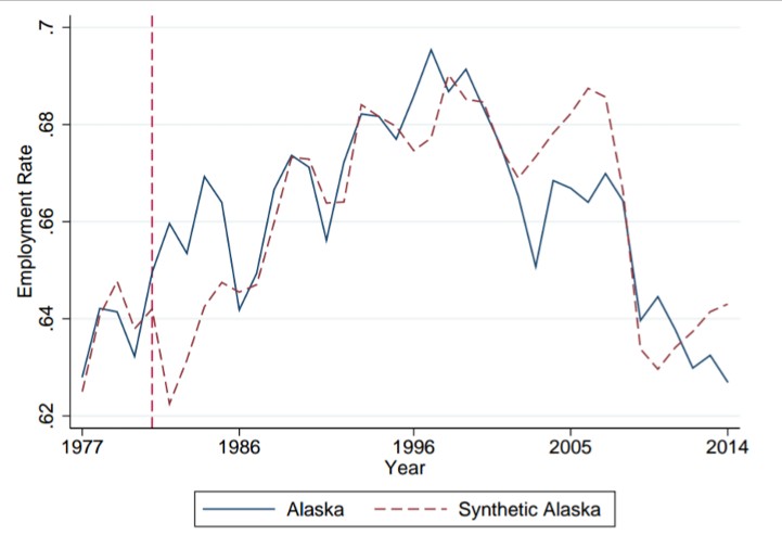 Aunque Finlandia es el más conocido, no es el único país en el que se ha implementado una renta básica. Los ciudadanos de Alaska reciben cada año 2000 dólares desde 1982 con el único requisito de haber residido allí durante un año. Aunque dividiéndolo entre 12 meses no sea una gran cantidad de dinero, es un ejemplo muy usado en el análisis de los efectos de la renta básica. Un estudio reciente de los economistas Damon Jones e Ioana Marinescu muestra los efectos sobre el empleo de tal medida. En el gráfico siguiente podemos ver dos líneas: la línea azul representa la evolución del empleo en Alaska y la roja cómo habría evolucionado sin la existencia de dicha renta.