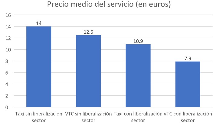 Por otra parte, según un estudio de AFI, se estima que el precio del mismo servicio prestado por VTC es 2,5 euros más barato que si es prestado por el taxi, y que si se liberalizase por completo, sería 3 euros más barato que el del taxi, pero es que el del taxi sería entonces también más barato que ahora en un 25%.