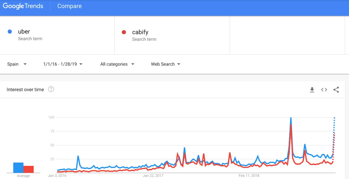 El siguiente gráfico, elaborado con Google Trends, muestra que el fenómeno está volviendo a repetirse en enero de 2019, en el marco de la huelga de taxistas que están viviendo Madrid y Barcelona. La popularidad de Cabify y Uber en el motor de búsqueda de referencia ha vuelto a dispararse de forma súbita, facilitando la adopción de ambas plataformas por parte de curiosos que, con el tiempo, bien pueden pasar a convertirse en clientes de los VTC.