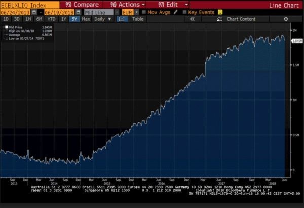 El mejor indicador para medir el estrepitoso fracaso del QE es la evolución de los depósitos intradía. Al inicio del programa ascendían a 125.000 millones de euros, y actualmente, superan los 1,8 billones de euros. Esto son recursos que los bancos comerciales tienen a su disposición para conceder créditos a los agentes económicos -familias y empresas-, y, sin embargo, deciden depositarlos en el BCE, a pesar de que tienen que pagar un tipo de interés -tasa de reserva- del 0,2%.