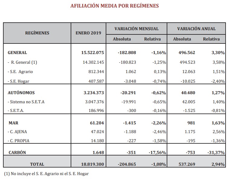 La Seguridad Social cerró enero con un descenso medio de 204.865 afiliados (-1,08%), su mayor retroceso en este mes desde 2013, cuando la economía nacional todavía estaba inmersa en la recesión. De este modo, el número de ocupados se situó en un total de 18.819.300 personas, según ha informado este lunes el Ministerio de Trabajo.